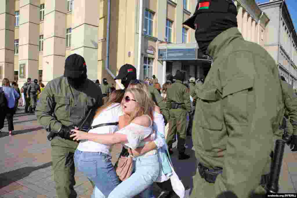 Сілавікі ў балаклавах працягвалі затрымліваць удзельніц акцыі, якія спрабавалі ўцячы, у дварах менскай гімназіі № 23. Там затрымалі некалькі дзясяткаў жанчын