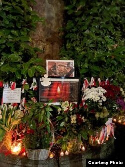 «Наш мэмарыял зьявіўся насупраць амбасады Беларусі яшчэ ўлетку. Спачатку людзі ўскладалі кветкі на прыступкі амбасады. Супрацоўнікі амбасады скардзіліся, і мы пагадзіліся перанесьці яго ў іншае месца, праз дарогу. За ім штодня даглядалі актывісты дыяспары і сябры», – кажа Элісан.