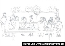 «У камэры ў Баранавічах на памяць, фотаапарата не было, я намалявала алоўкам, як я гэта бачыла. Камэра вялікая, і як я сядзела на сваіх нарах, я бачыла два шэрагі нар, пасярэдзіне доўгі стол і лаўкі. Дзяўчаты сьмяяліся і назвалі гэты малюнак „12 апосталаў“, бо на ім было 12 чалавек».