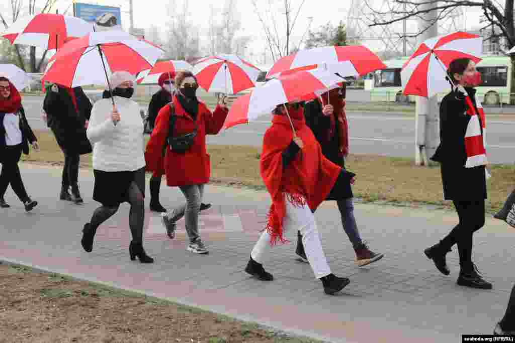 Гэтым разам жанчыны зь бел-чырвона-белымі парасонамі прайшлі па менскім праспэкце Пераможцаў.