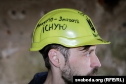 Пераўвасабленьне падкрэсьлівае стылёвая жоўтая каска, расьпісаная ўкраінскімі калегамі на памяць аб досьведзе працы работнікам сцэны ў акадэмічным тэатры Львова.