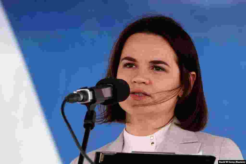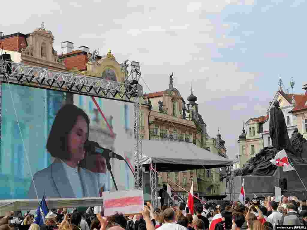 Сотні людзей прыйшлі на акцыю салідарнасьці зь Беларусьсю ў цэнтры Прагі. Выступае Ціханоўская. Фота
