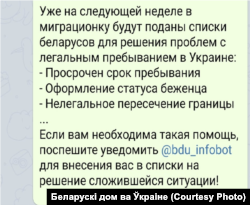 У чатах тэлеграм-каналу «Беларускага дому ва Ўкраіне» пэрыядычна публікавалі інфармацыю пра тое, што рыхтуюцца падаць у Дзяржаўную міграцыйную службу сьпісы беларусаў, якія нелегальна перасеклі мяжу, пратэрмінавалі дазволены час знаходжаньня іншаземцаў ва Ўкраіне, і тых, хто жадае атрымаць статус уцекача. Цяпер гэтыя паведамленьні выдаленыя.