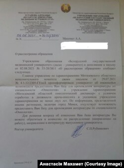 «Інтэрнатура ў мяне павінна была быць у Аляксандрава [Рэспубліканскі навукова-практычны цэнтар анкалёгіі і мэдычнай радыялёгіі імя М.М.Аляксандрава. — РС], якому падпарадкоўваюцца ўсе анколягі Менскай вобласьці, груба кажучы. Лягічна, што яны і рыхтуюць спэцыялістаў для свайго раёну. Але пасьля экзамэнаў я даведалася, што мне не даюць накіраваньня. Мяне выклікалі да дэкана, сказалі, што ў Аляксандрава мяне прыняць ня могуць праз тэхнічныя цяжкасьці».