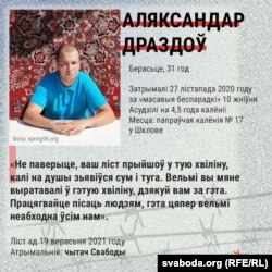 «Стараюся займаць сябе па максымуму, захоўваючы розум і цела. Вялікая падмога ў гэтым — лісты ад жонкі, ад знаёмых і незнаёмых людзей, як зь Беларусі, так і з-за яе межаў. Гэта дапамагае мне адчуваць сябе ня кінутым, не забытым, адчуваць адзінства і падтрымку».