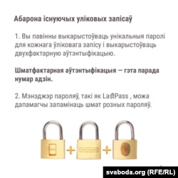 • Уключыце і выкарыстоўвайце двухфактарную аўтэнтыфікацыю для доступу да вашых уліковых запісаў.