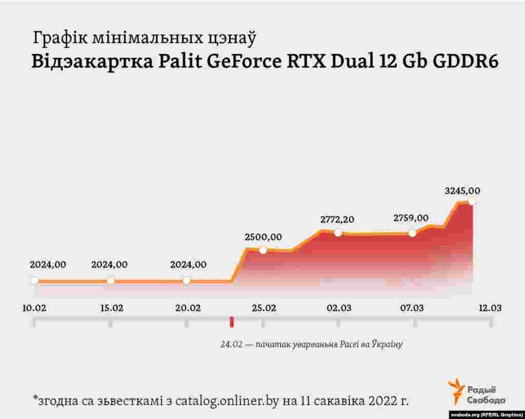 Напад Расеі на Ўкраіну адазваўся рэзкім выбухам цэнаў на ўсе тавары ў Беларусі, асабліва замежнай вытворчасьці. Па ўсім відаць, што гэта яшчэ не канчатковыя цэны, бо даляр не спыняе свайго росту. На графіках вы можаце пабачыць мінімальную цану кожнага з тавараў у залежнасьці ад даты.
