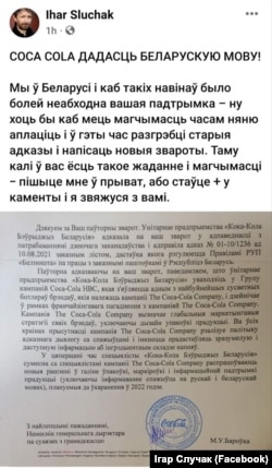 У пацьверджаньне таго, што неўзабаве ў гандлёвых сетках бутэлькі Coca-Cola будуць зь беларускай мовай на этыкетках, Случак апублікаваў у сваім фэйсбуку афіцыйны ліст кампаніі.