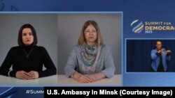 Апазыцыйная палітык Сьвятлана Ціханоўская і жонка нобэлеўскага ляўрэата і палітвязьня Алеся Бяляцкага Натальля Пінчук выступілі па чарзе ў онлайн-фармаце на Другім саміце за дэмакратыю, які праходзіць у Вашынгтоне пад патранатам прэзыдэнта ЗША Джо Байдэна.