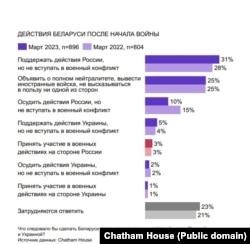 Пры гэтым нават прыхільнікі вайны, якія складаюць прыблізна траціну апытаных, не жадаюць, каб Беларусь у ёй удзельнічала. У беларускім грамадзтве сфармаваўся антываенны кансэнсус.
