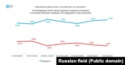 Паводле Russian field, увесь час назіраньняў перавага была на баку спыненьня ваенных дзеяньняў, калі такое рашэньне прыме Пуцін.