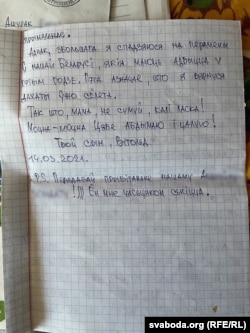 Вельмі непакоюся, калі чую, што там, у вас на волі вельмі небясьпечная абстаноўка з „карона-вірусам“. Беражы сябе, мама! Я ведаю, як ты любіш пахадзіць па Бярозаўцы! Але, прашу цябе, сьцеражыся! Хоць маску насі. Упэўнены, што ты так і зробіш.