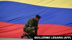 На фоне сьцяга якой краіны сядзіць вайсковец?