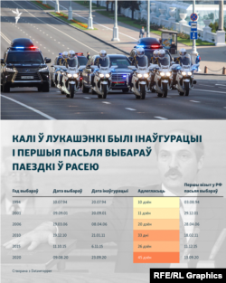 2020 год быў адзіным выключэньнем, калі Лукашэнка сустрэўся з прэзыдэнтам Расеі да інаўгурацыі, у астатніх 5 выпадках інаўгурацыя папярэднічала першаму пасьлявыбарчаму візыту ў РФ.