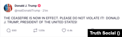 «Перамірʼе цяпер уступіла ў сілу. Калі ласка, не парушайце яго!», — напісаў прэзыдэнт ЗША Дональд Трамп на на сваёй плятформе Truth Social.