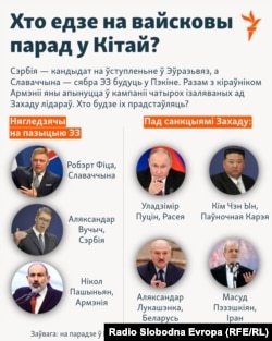 Кітайскі кіраўнік Сі Цзіньпін сабраў у Пэкіне кіраўнікоў 26 дзяржаваў. Яны 3 верасьня маюць наведаць вайсковы парад у гонар 80-й гадавіны цырымоніі капітуляцыі Японіі ў 1945 годзе і заканчэньня Другой Усясьветнай вайны. Сярод замежных гасьцей практычна ня будзе заходніх лідэраў — выняткам можна лічыць толькі прэм’ер-міністра Славаччыны Робэрта Фіцу, які паведаміў, што едзе ў Кітай.