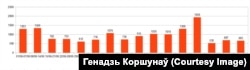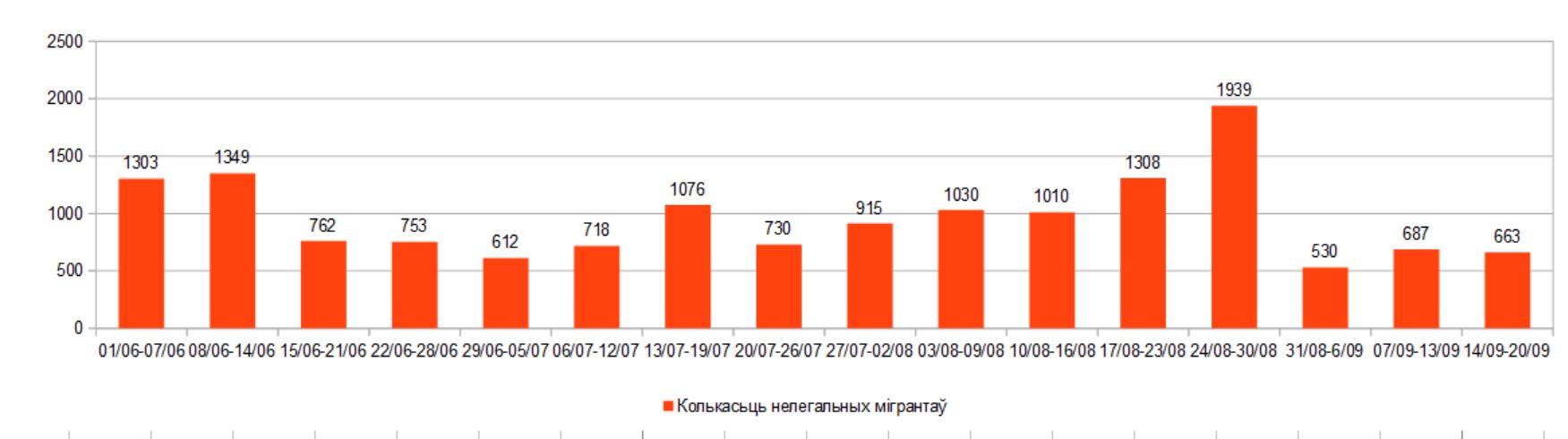 Уяўленьне пра тое, што адбываецца на мяжы, дае графік дасьледчыка Цэнтру новых ідэяў Генадзя Коршунава, створаны на падставе памежнай статыстыкі эўрапейскіх суседзяў Беларусі. Ён паказвае штотыднёвую дынаміку колькасьці нелегальных мігрантаў, якія спрабавалі патрапіць у Польшчу праз мяжу зь Беларусьсю ў чэрвені — верасьні сёлета.