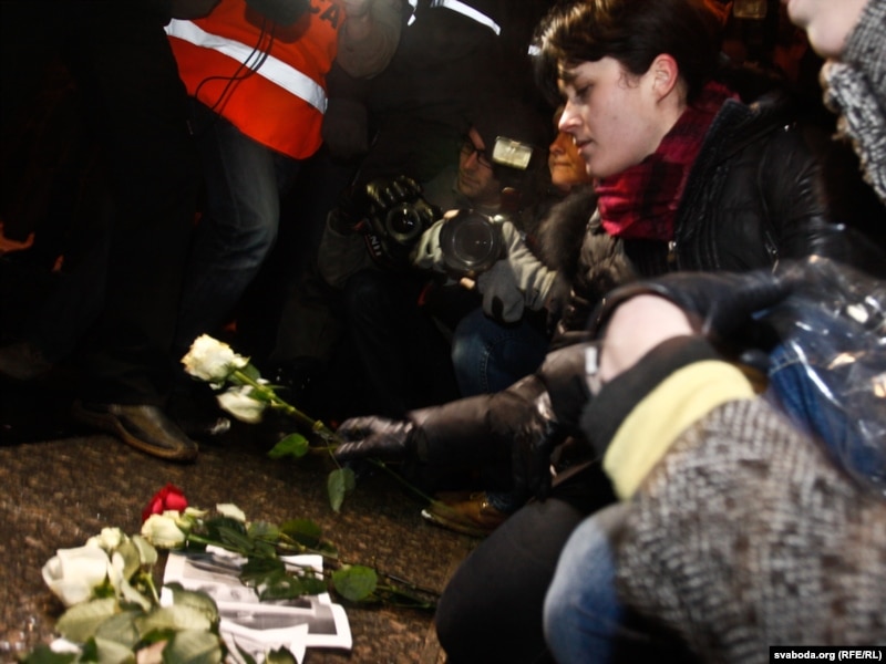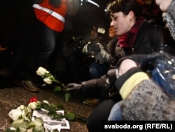 Вуліца Янкі Купалы. Наста Палажанка і Тацяна Шапуцька паклалі да ног міліцынтаў ля ўваходу ў сквэр Янкі Купалы партрэты Зьмітра Дашкевіча і Эдуарда Лобава і букеты бел-чырвона-белых ружаў.