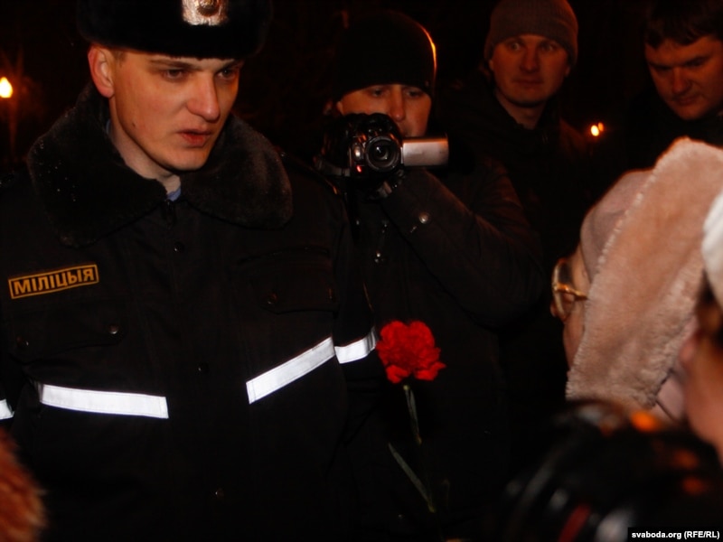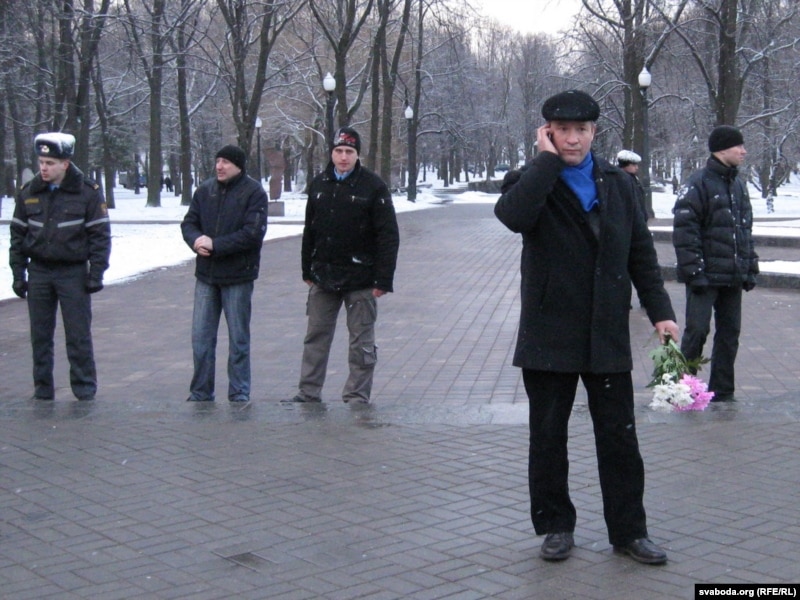 18:05 Алесь Дашчынскі: «Я знаходжуся каля ўваходу ў сквэр Янкі Купалы. Акцыя, аднак, не пачалася. Міліцыя перакрыла ўсе ўваходы ў сквэр. Людзі зь бел-чырвона-белымі букетамі кветак ня могуць прайсьці ў сквэр. Міліцыянты кажуць, што знайшлі падазроны прадмет з дратамі. Пасьля яго праверкі, маўляў, людзей пусьцяць. Некаторыя людзі кладуць букеты проста ля ўваходу ў сквэр. Іншыя пайшлі ў бок пляца Якуба Коласа, каб ускласьці кветкі там. Сквэр цалкам бязьлюдны. Там зусім нікога няма. Ужо ў 16:45 туды не пускалі. Нікога не прапускаюць і цяпер. Наконт пакладзеных ля ўваходу кветак. Я сустрэў спадарыню Вольгу Кароль, якая бачыла, як пакладзены ля ўваходу ў сквэр букет міліцыянт падняў, паламаў і выкінуў у сьметніцу».
