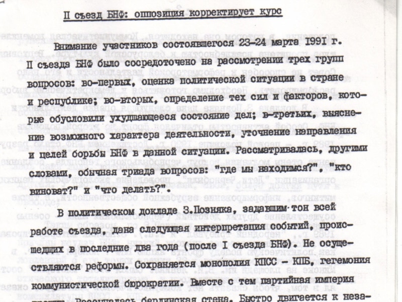 Я сумняваўся, ці варта пісаць у гэтым цыклі, заснаваным на ўласных успамінах, пра II зьезд БНФ – падзею, у якой ня ўдзельнічаў, бо якраз у канцы сакавіка 1991-га ў Віцебску трапіў у шпіталь. Пра вынікі зьезду ведаў з аповедаў калег і газэтных публікацыяў, і таму аўтар гэтых радкоў – у роўных пазыцыях з чытачом. Сёньня перада мной некалькі старых газэтаў яшчэ “даінтэрнэтаўскай эпохі” і тая, знойдзеная з Пазьняком, аналітычная запіска ЦК.
