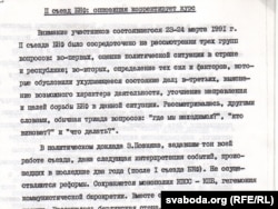 Заўважым, што аналітык ЦК прызнаў адказнасьць кампартыі за нізкую палітычную культуру насельніцтва (двурушнасьць: на сустрэчах у заводзкіх цэхах члены парткамаў нам крычалі “Хопіць вам на сэсіі палітыкі! Спыніце палітыканства! Займіцеся эканомікай!”). Заўважым, што вызначэньне кампартыі як злачыннай арганізацыі ў дакумэнце ЦК КПБ падаецца без двукосься (памылка машыністкі?). Але больш прыкметна іншае: у запісцы зьвяртаецца ўвага на тое, што лідэр БНФ прапануе “аддзяляць юрыдычную адказнасьць партыі ад адказнасьці індывідыюма”, іншымі словамі, гаворка не ідзе пра суд над кожным камуністам. (Дакладна выказваньне Пазьняка гучала так: “Трэба даць магчымасьць звычайным людзям зрабіць выбар і пакінуць КПСС, а не ствараць сабе ворагаў там, дзе могуць быць сябры”). І кіраўніцтва кампартыі цудоўна ведала гэта, аднак з экранаў БТ, у газэтах, на сходах людзей палохалі тым, што “Пазьняк заклікае судзіць камуністаў”.