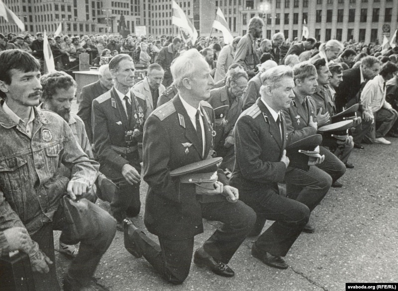 Мітынг супраць ГКЧП, арганізаваны дэпутатамі Апазыцыі БНФ. 20 жніўня 1991 г. Выступае айцец Андрэй Абламейка.
