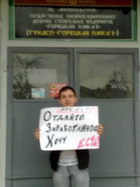 Яшчэ непадалёк ад мяне стаіць службовая машына з двума супрацоўнікамі міліцыі. Пакуль нічога ня робяць. У руках я трымаю плякат: „ПМК-1, аддайце заробленае. Хачу есьці“. Буду стаяць, пакуль не забяруць адсюль».