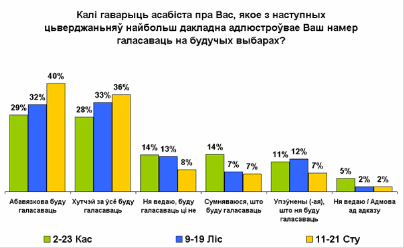 Сацыёляг цэнтру Лявады Барыс Дубін зьвяртае ўвагу, што чаканьні людзей наконт паляпшэньня іх жыцьця зьвязаныя з чаканьнем, што выбары нічога ня зьменяць, што пераемнік будзе працягваць курс дзейнага прэзыдэнта: