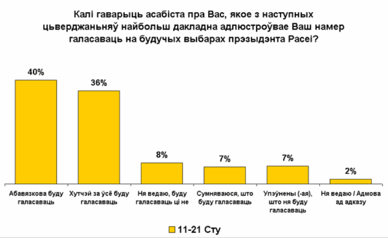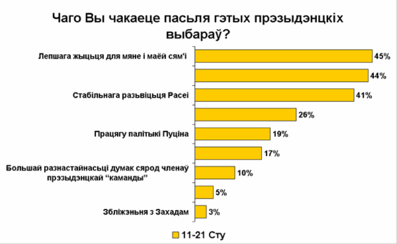 Вынікі выглядаюць парадаксальна: 45% апытаных выказваюць сумневы ў тым, што выбары пройдуць сумленна, 65% мяркуюць, што адказ на пытаньне, хто будзе наступным прэзыдэнтам, залежыць ад Уладзімера Пуціна і ягонай адміністрацыі, і толькі 19% мяркуюць, што гэта будзе залежаць ад волі выбаршчыкаў. І разам з тым тры чвэрці апытаных кажуць, што пойдуць галасаваць, пры гэтым 45% апытаных чакаюць ад прэзыдэнцкіх выбараў лепшага жыцьця для сябе і сваёй сям’і і прыкладна столькі ж – падвышэньня пэнсіяў і заробкаў.