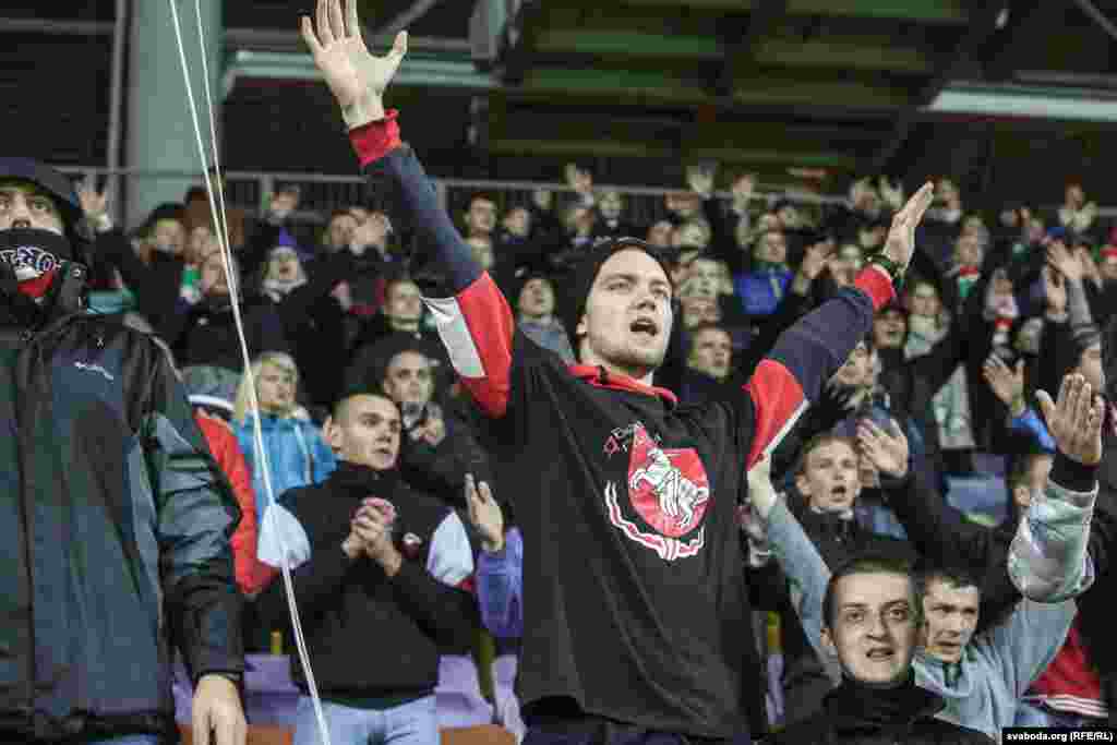 Першы тайм зборная Беларусі прайграла 0:1 — Даві Пропэр (на фота зьлева) забіў на 24-й хвіліне. Але на 55-й хвіліне Максім Валадзько (на фота ў цэнтры) зраўняў лік.