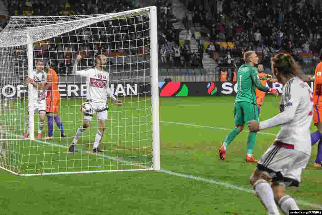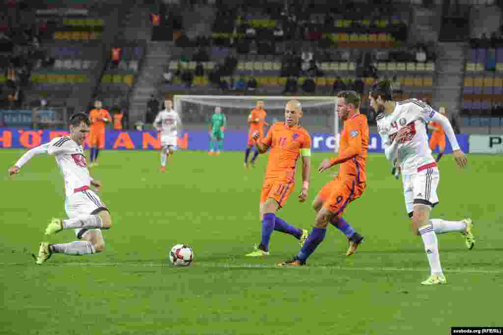 Ды на 83-й хвіліне пэнальці ў вароты Чэрніка забіў Ар’ен Рабэн. Але беларусы спрабавалі адыграцца і наносіла ўдар за ўдарам па варотах Нідэрляндаў. Ужо перад самым канцом гульні беларусам са штрафнога забіў Мэмфіс Дэпай.