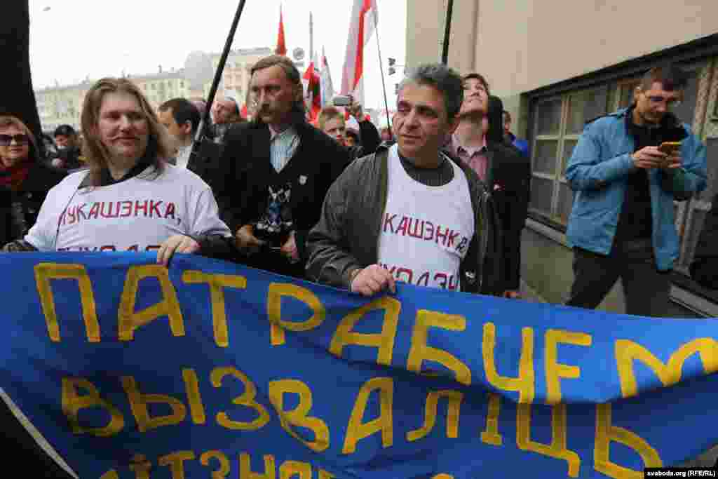 Адні з арганізатараў акцыі Аляксей Янукевіч і Віталь Рымашэўскі каля храма Іконы Божай Маці «Адшуканьне згінулых» — канцавога пункту маршруту шэсьця