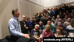 Катэгарычнасьць чыноўнікаў выклікала ў залі сьвіст і незадаволеныя выкрыкі. Начальнік аддзелу прадпрымальніцтва Менскага аблвыканкаму Дзяніс Кубленка пратрымаўся на трыбуне найдаўжэй з калегаў, але сагналі ўрэшце і яго: