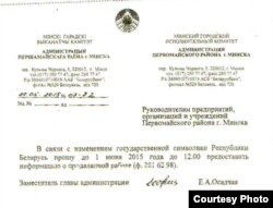 «У сувязі са зьменай дзяржаўнай сымболікі Рэспублікі Беларусь да 1 чэрвеня 2015 году да 12:00 прадставіць інфармацыю пра зробленую працу», — такое распараджэньне за подпісам намесьніцы адміністрацыі Першамайскага раёну Алены Асадчай атрымалі мясцовыя прадпрыемствы.