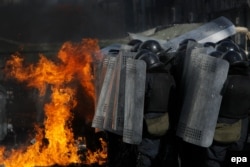 Праваахоўнікі адціснулі пратэстоўцаў ля барыкадаў, што ахоўваюць майдан Незалежнасьці на вуліцы Інстытуцкай.
