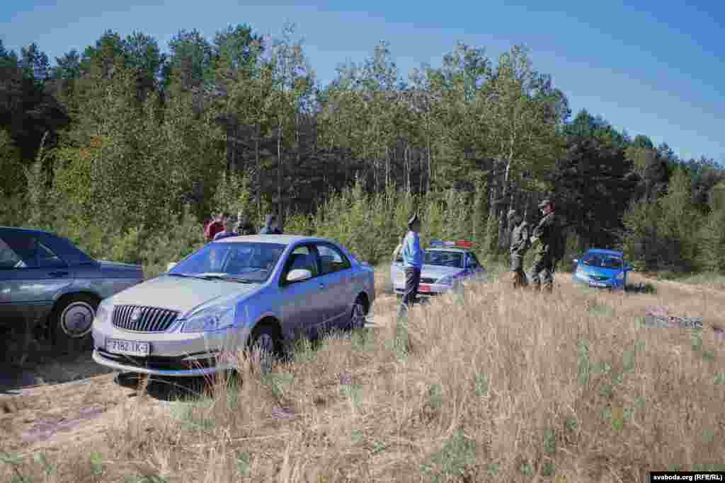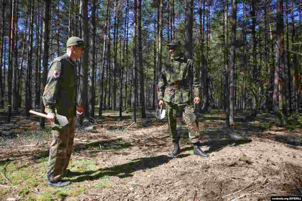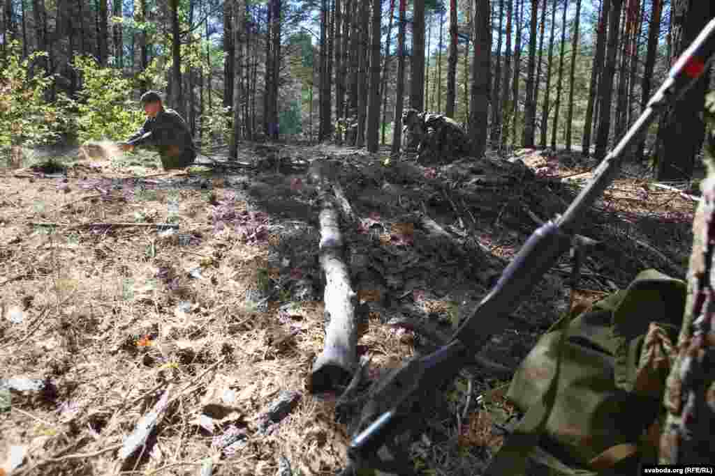 Прадстаўнікі лясгасу замяраюць плошчу пашкоджанай зямлі.