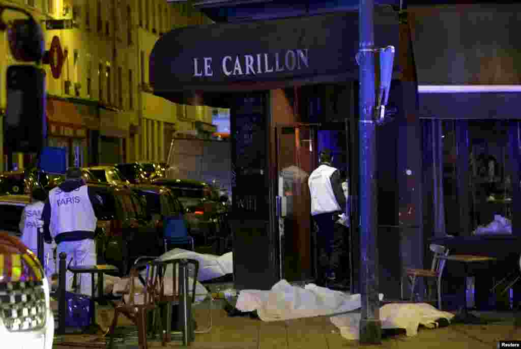 Пажарныя дапамагаюць параненаму каля канцэртнай залі Bataclan.