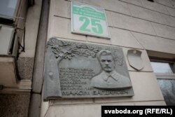 Бронзавы Максім Багдановіч глядзіць на памятную шыльду на доме № 25. Шыльда хлусіць, што «на гэтым месцы знаходзіўся дом, дзе нарадзіўся паэт». Насамрэч той будынак знаходзіўся ў двары 25 дому. Гэта быў адзін з самых знакавых беларускіх адрасоў. Бо да рэвалюцыі тут жа месьціліся рэдакцыі часопісаў «Саха» і «Лучынка».