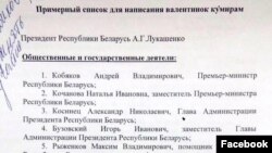Прапанаваны сьпіс асобаў для «напісаньня валянцінак кумірам» апублікаваў у Фэйсбуку бацька аднаго з школьнікаў Кастусь Лісецкі.