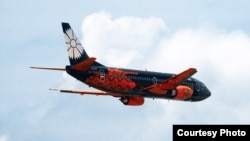 Арыгінальны борт пафарбаваны ў асноўным у чорны колер, па фюзэляжы — аранжавы арнамэнт, а на хвасьце — белы васілёк. На ліўрэі напісана: «Гульня зь Беларусі, якую ведае ўвесь сьвет».