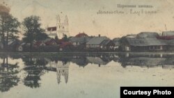 На паштоўцы — гарадзкі краявід пачатку мінулага стагодзьдзя, якога сёньня ўжо ня ўбачыш.