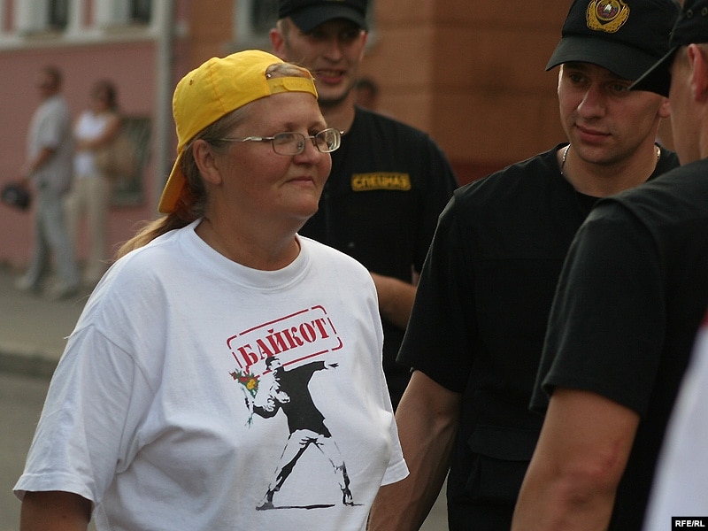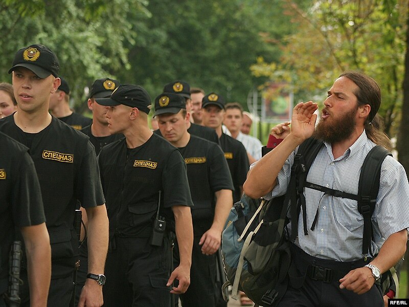 Увесь час калёну суправаджалі дзьве асобы, якія ўвесь час выкрыквалі лёзунгі, крычалі дэманстрантам, што яны ўсе “прадаліся ЗША”, “служаць Бушу” і падобнае. Спэцназаўцы не дазвалялі рабіць ім заўвагі, і гэтак яны прайшлі за калёнай да вуліцы Максіма Багдановіча.