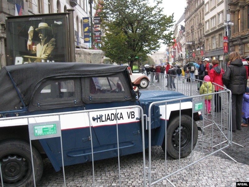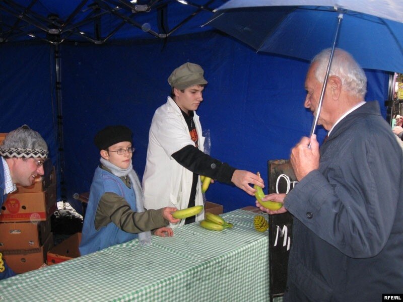 Ну а эру сацыялізму прыгадвалі талёны на цукар, на мыла, патрульная машына СТВ – гэта чэская назва КДБ, і яшчэ для поўнага куражу чэхі утварылі чаргу па бананы – гэтым успамінаючы тое, што калісьці бананы , як і апэльсіны былі толькі пад Новы год. Калі я папрасіла дзеля здымка выкласьці на прылавак пабольш бананаў , то прадавец амаль усур’ёз адрэагаваў: вы што, бананы ў нас толькі пад прылаўкам.