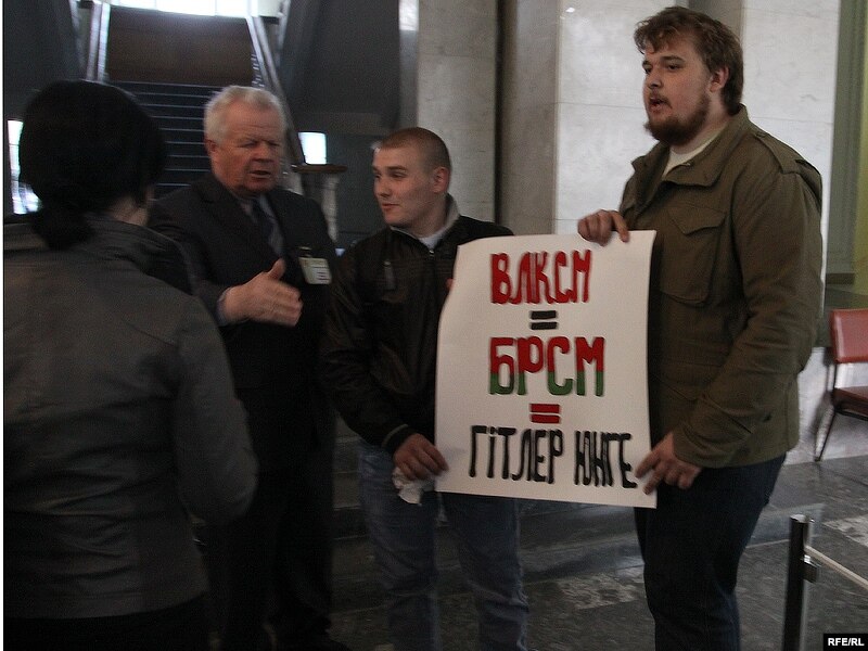 Затрыманыя спачатку дайшлі да офісу БРСМ, што знаходзіцца побач з Кастрычніцкай плошчай і перадалі туды дыск з урыўкамі фільму Юрыя Хашчавацкага, дзе Аляксандар Лукашэнка выказваецца ў падтрымку Гітлера. Маладзёвыя лідэры шлі з плякатам ВЛКСМ = БРСМ = Гітлерюгенд. Людзі, якія прыйшлі на плошчу распавялі, як бачылі затрыманьні іншай моладзі ў мэтро яшчэ на падыходах да Кастрычніцкай плошчы.