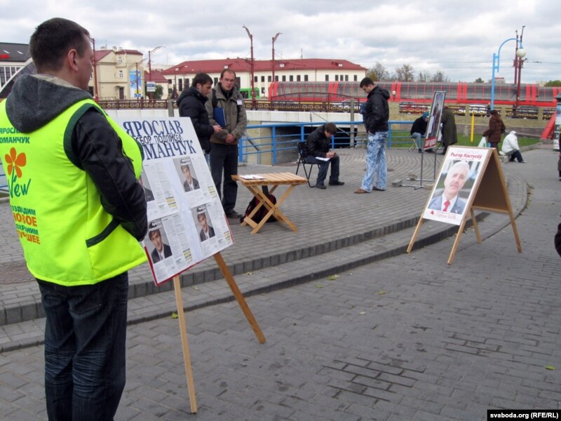 Сёньня я наведаўся на вуліцу Паліграфістаў у Горадні. Тут, каля ўваходу на цэнтральны гарадзкі рынак, зьбіраюць подпісы за Яраслава Раманчука, Рыгора Кастусёва, Уладзімера Някляева і Андрэя Саньнікава. Невялікі кавалак тэрыторыі людзі ўжо назвалі «Пляцам Свабоды». І менавіта тут часта гучаць заявы пра байкот выбараў.