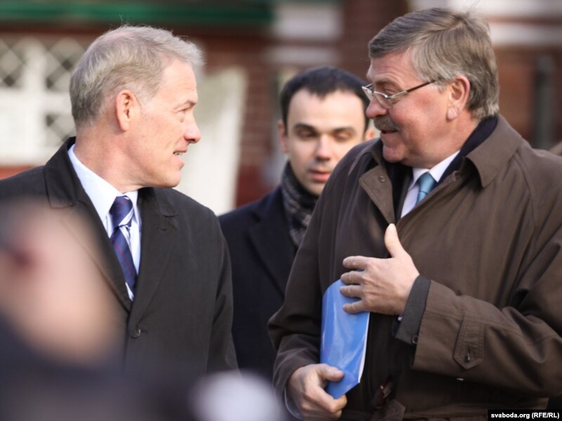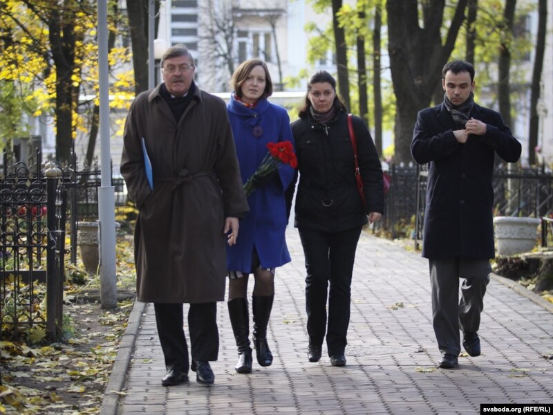 Часовы павераны амбасады ЗША ў Беларусі Майкл Скэнлан і прадстаўнік ААН у Беларусі Антоніўс Брук на Вайсковых могілках у Менску.